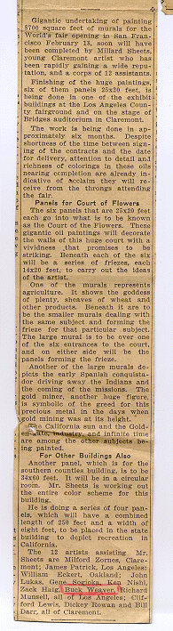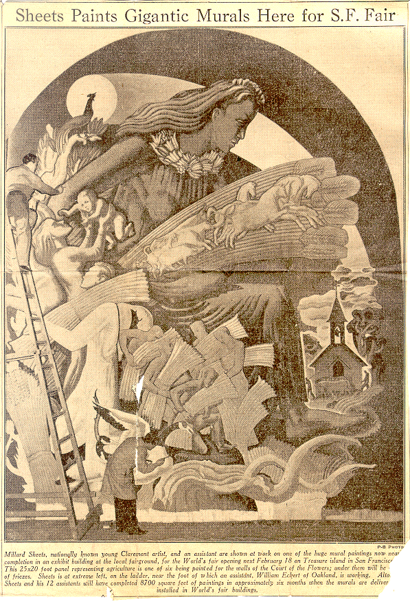 The Progress-Bulletin, Pomona, California. Undated. "Sheets Paints Gigantic Murals Here for S.F. Fair".
